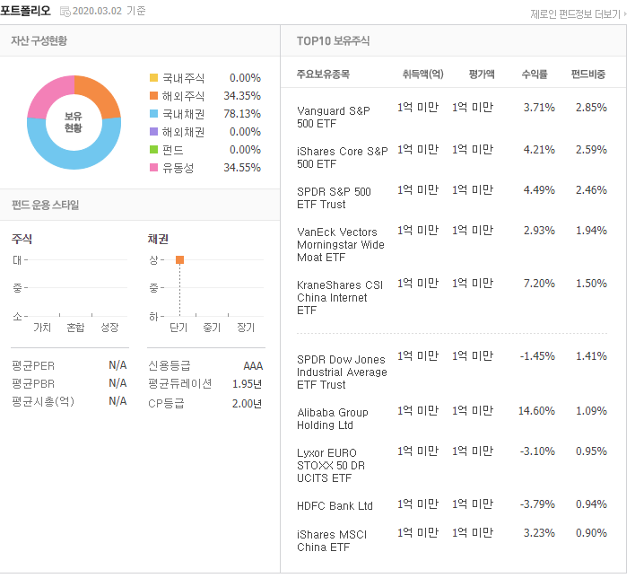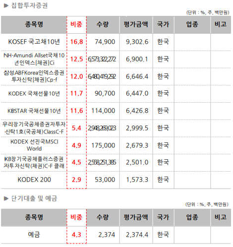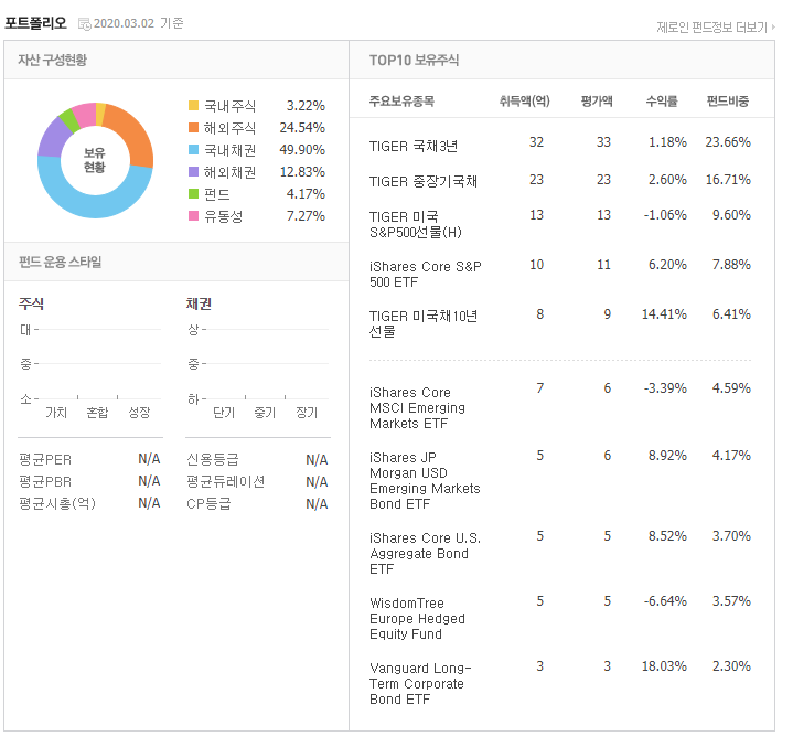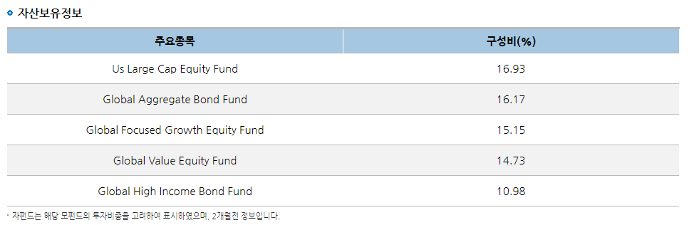 사실 이 펀드는 단순 채권혼합형이 아니라, 다양한 주식형펀드+채권형펀드를 조합하여, 상황에 맞춰 상품들을 변경하여 투자하는 펀드 상품입니다. 그래서 단순 포트폴리오를 조회시에 내용이 안나올 수 있습니다. 장점으로는 다양한 펀드에 나눠서 투자하기 때문에 자산분배효과를 누릴 수 있으며, 대체적으로 위험요소를 낮출 수 있습니다. 이 펀드 하나만으로도 여러개로 나눠서 투자하는 효과를 볼 수 있기 때문에, 올라운드형으로 펀드를 찾는다면 괜찮은 상품입니다.