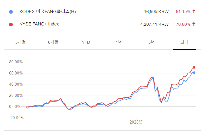 4차산업을 투자하면서도, 유명한 지수인 FANG 지수에 투자하는 상품인 KODEX 미국FANG플러스(H)를 매수하는 것도 매력이 있어 보입니다.