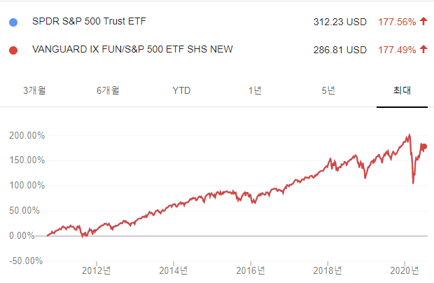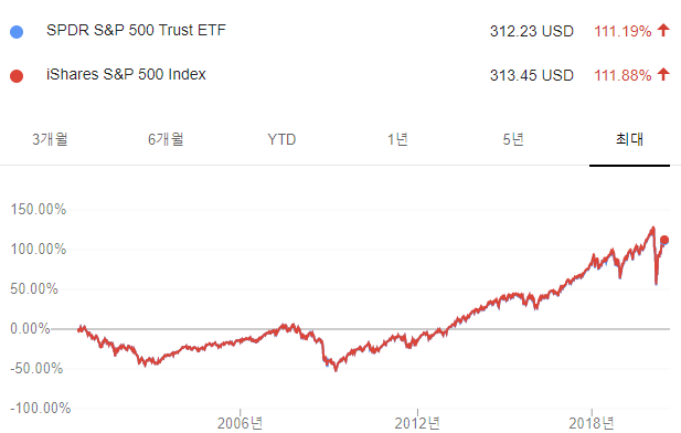 경쟁 ETF인 IVV의 그래프와 비교하여도 거의 차이가 없는 모습을 보여주고 있습니다. SPY든 IVV든 같은 S&P500지수를 추종하기 때문에 본인이 더 사고 싶은 상품으로 구매하면 좋을 듯 싶습니다.