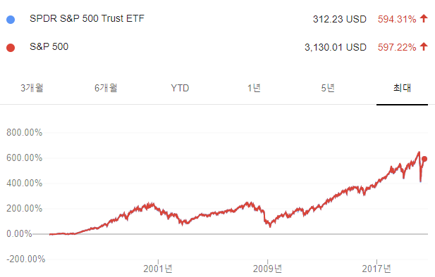 상장이후로 S&P 500 지수를 그대로 추종하고 있다는 걸 알 수 있습니다. 장기간의 그래프로 볼때, 꾸준히 우상향을 그리고 있는 S&P500 지수의 투자한다면, 분산투자의 효과와 리스크를 줄이고 안정적인 수익률을 낼 수 있는 큰 장점이 있습니다.