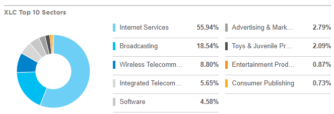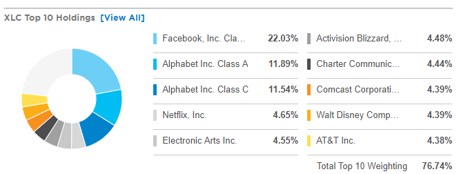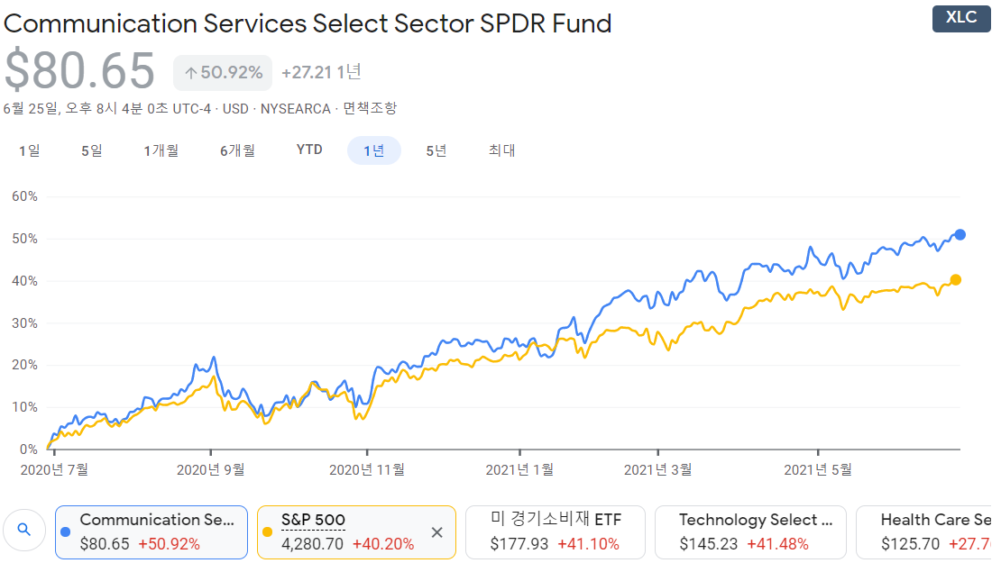 그래프는 S&P500 보다는 좀 더 고수익을 내주고 있습니다. XLC ETF는 구글과 페이스북에 편향점이 높다보니 두기업이 크게 오른다면, 큰 수익률이 나올 수 있을 것 같습니다.