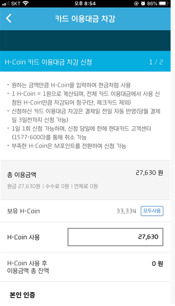 H-COIN 카드이용대금 차감