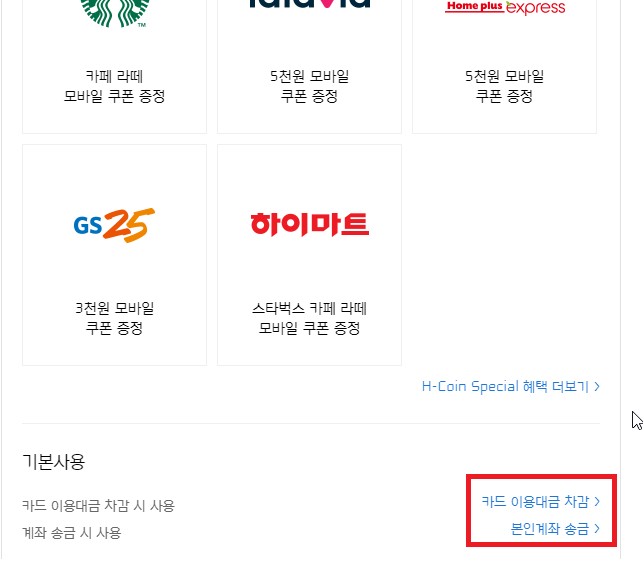 아래로 내려가다보면, 작은글씨로 H-Coin 사용 혜택 비교를 선택하여 줍니다.