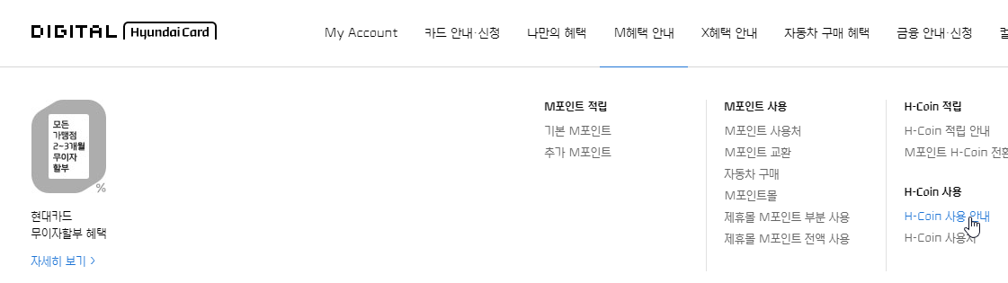 PC에서 현대카드 홈페이지에 접속하여 줍니다. 그리고 M혜택 안내 => H-Coin 사용 안내를 선택하여 줍니다.