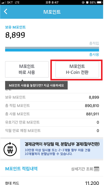M포인트를 실제 현금과 같은 H-COIN으로 전환하신 뒤에 사용하시면됩니다. 단 주의사항이 있는데 M포인트를 H-COIN로 전환하시면 포인트가 줄어드는 상황이 생깁니다.