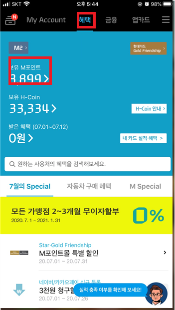그런뒤에 혜택을 눌러줍니다. 그리고 보유 M포인트를 선택하여 줍니다.