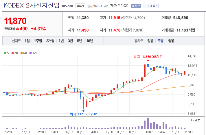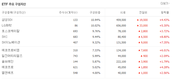 - 위의 TIGER 2차전지테마보다 상위기업의 구성 비중이 높아서, 좀 더 대기업 위주에 투자를 원하는 분에게 맞을 것 같습니다.