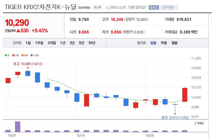 - TIGER KRX2차전지K-뉴딜는 한창 정부에서 뉴딜펀드를 발표하면서 새롭게 추가된 펀드입니다. 상장일이 채한달도 되지 않은 상황입니다.