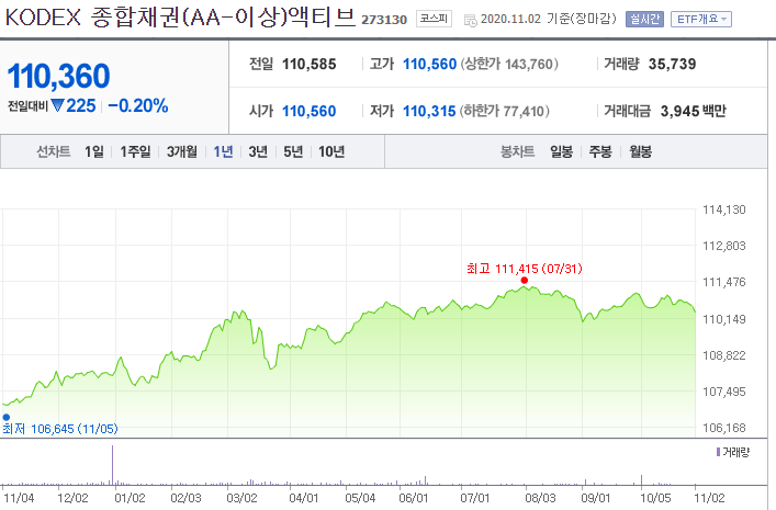 - KODEX 종합채권(AA-이상)액티브은 조금더 고수익을 원한다면, 추천한다. 시가총액은 1조4300억대로 대형우량펀드이며, 삼성자산운용에서 운용하고 있으며, 연보수가 0.07%로 거의 없는 수준이다.