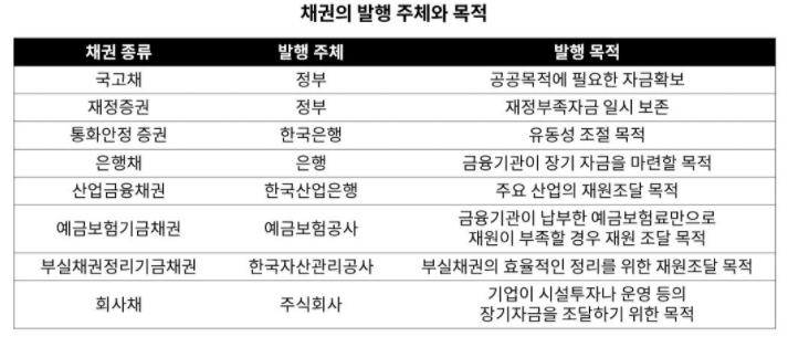 정부, 공공기관, 기업이 비교적 장기의 자금을 조달하기 위해 투자자들로부터 돈을 빌리고 일정기간 후에 돌려주겠다고 약속한 채무증서(증권)이다. 채권의 발행자겨을 갖춘 기관은 법으로 정해져 있으며, 발행자격이 있더라도 발행을 위해서는 정부의 승인이 필요하다.