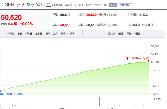 - TIGER 단기채권액티브는 미래에셋자산운용이 운영하는 단기채권펀드로, 시가총액은 6700억 수준으로 대형펀드이며, 펀드보수가 연 0.07%로 아주 저렴하여서 인기가 있다.