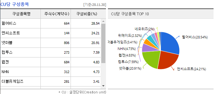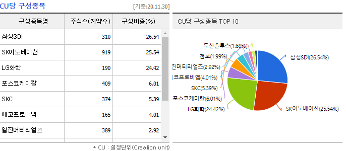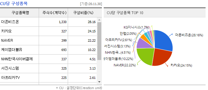 - 2차전지,바이오,인터넷,게임 뉴딜지수 : 각 산업군 시가총액 상위 10개씩 구성되며, 상위 3개는 25%씩 나머지7개에 25%에 비중을 산정하는 방식