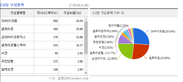 - 위에 소개한대로, 상위 3개종목인 SK바이오팜, 셀트리온, 삼성바이오로직스에 각각 25%씩 투자하며, 나머지 7개의 종목에 25%를 투자하는 상품입니다.