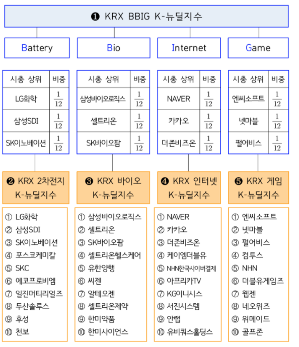 - “KRX BBIG K-뉴딜 지수”는 한국거래소에서 발표하는 지수로서, 유가증권시장 및 코스닥시장 상장종목 중 2차전지(Secondary Batterry), 바이오(Bio), 인터넷(Internet), 게임(Game), 총 4개 산업군 내 대표기업으로 시가총액 상위 3종목씩 총 12종목을 구성종목으로 하는 지수입니다.