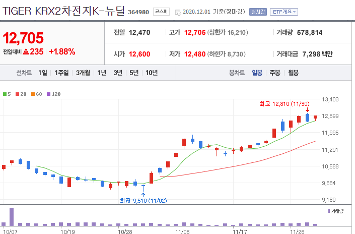 뉴딜펀드가 상장된지도 두달이 되어 갑니다. 초반에 모두 하락세를 보이다가 10월말을 기점으로 모든 뉴딜지수 ETF 상품은 상승세를 타고 있는 상황입니다.