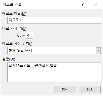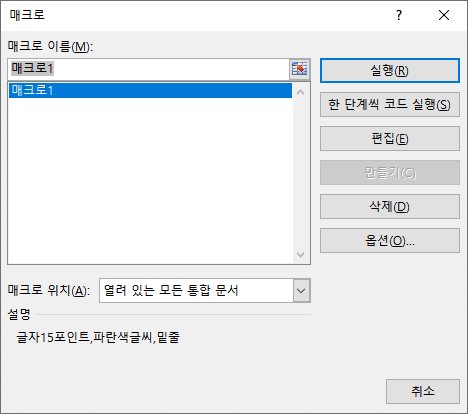 매크로로 기록한 내용은 글자를 15포인트로 바꾸고, 글자색을 파란색으로, 그리고 밑줄을 넣어서 매크로로 만들어보겠습니다.