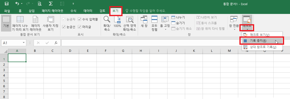 그리고서는 리본메뉴에서 [보기] - [매크로] - [매크로 중지]를 선택하여 줍니다.