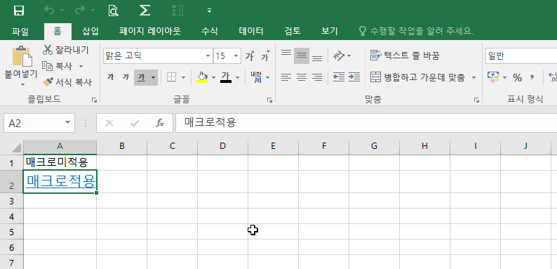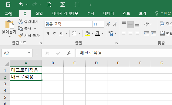 한번 매크로를 실행해보도록하겠습니다. 셀에 텍스트를 입력합니다.