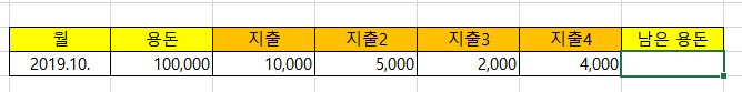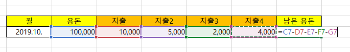 다음 처럼 용돈에서 지출 1~ 4까지 4가지 항목을 뺄셈을 진행하여야 합니다.