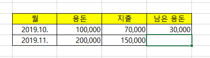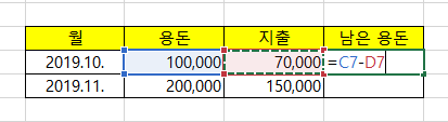 뺄셈을 할 용돈 셀을 선택하고 ( , ) 콤마를 입력해줍니다.