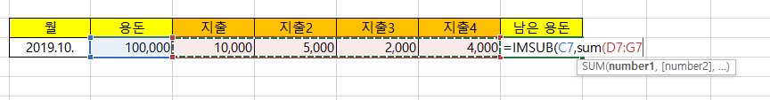 예제가 4개여서 그렇지 10개만 되도 시간이 꽤나 걸립니다. 이럴때, imsub 함수와 sum함수를 같이 써주시면 간단하게 계산이 가능합니다. =imsub 를 입력해서 함수를 선택하여 줍니다.