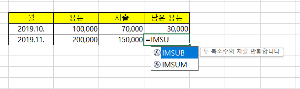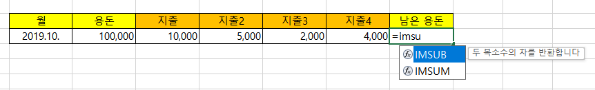 뺄셈을 할 셀로 이동해서, =imsub 를 입력하면 드롭박스에 해당 함수가 나온다.