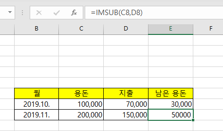 위쪽 함수란에 보면 함수가 입력이 된것을 확인하실 수 있습니다. imsub함수에 단순히 사용법을 알아보았으며, imsub 함수를 실제로 사용하는 경우에 대해서 알아보겠습니다.