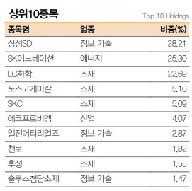 - 기초지수는 유가증권시장 및 코스닥시장 상장종목 중 2차전지(secondary Battery) 산업군 내 대표기업 10종목을 구성종목으로 하는 지수.
