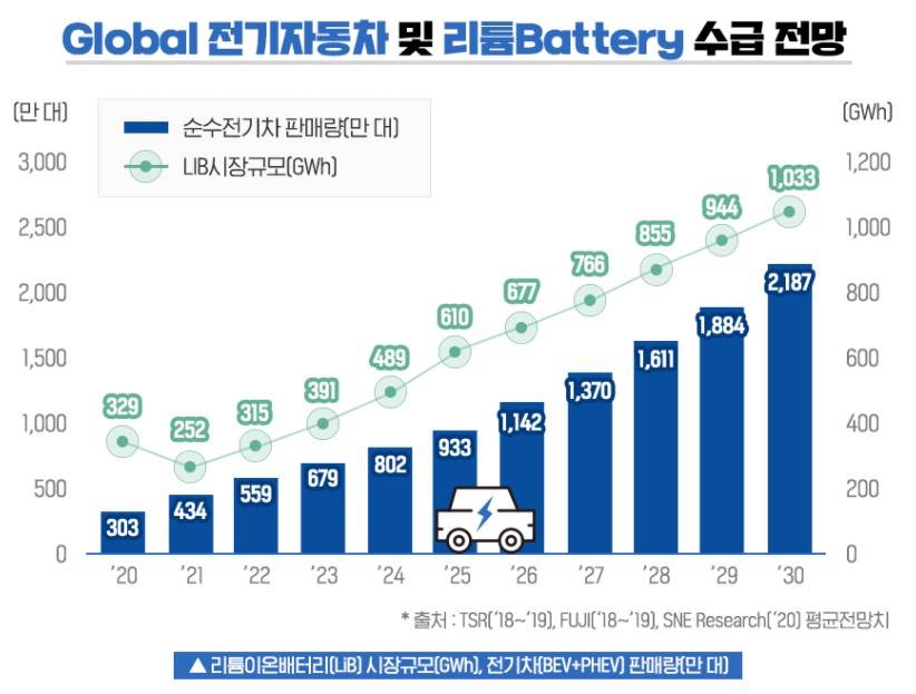 주요 리서치 기관에 따르면 글로벌 전기차 시장은 순수전기차(BEV+PHEV) 기준, 2020년 300만대에서 2025년에는 900만대로 급격하게 성장하고, 이에 따라 대표적 2차전지인 LiB(Lithium Ion Battery, 리튬이온배터리)시장규모도 ‘20년 329GWh(Gigawatt-Hour, 100만 KW를 시간당 사용하는 양의 단위)에서 2025년에 610GWh로 연평균 22%이상 성장할 것으로 전망된다.
