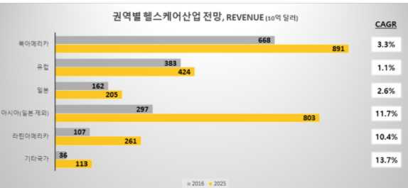 - 헬스케어산업 성장은 권역별로 상이하게 나타날 것으로 보인다. 선진국들(북아메리카, 유럽, 일본)의 연평균 성장률은 5%를 하회할 것으로 보이며 개발도상국들(아시아, 라틴아메리카, 기타 국가들)은 10% 이상의 빠른 성장세를 유지할 것으로 예상된다.