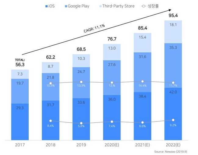 - 모바일게임은 매년 11%의 성장률로 규모 및 시장이 커지고 있다.