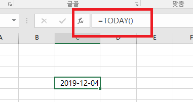 또 함수를 이용해서도 입력할 수 있습니다. =Today() 입력 후 엔터를 쳐줍니다.