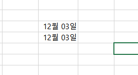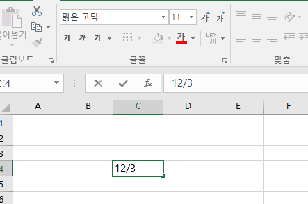 셀에 12/3 또는 12-3 을 입력하면 12월 3일 로 날짜가 표시됩니다.