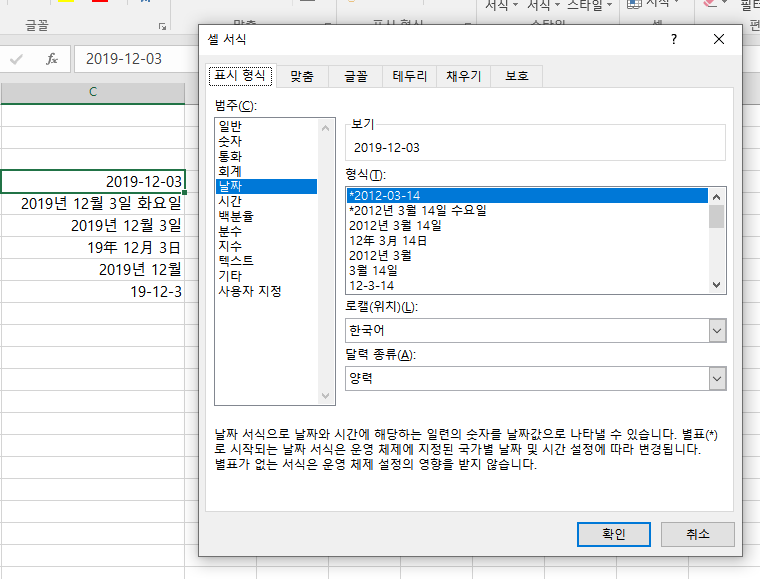그러면 다음과 같이 날짜 범주에서 다양한 형식이 나오는걸 확인하실 수 있습니다. 필요하신 양식으로 바꿔서 사용하시면 되겠습니다. 형식을 선택 후 확인을 누르시면 데이터가 형식에 맞는 형태로 출력이 됩니다.