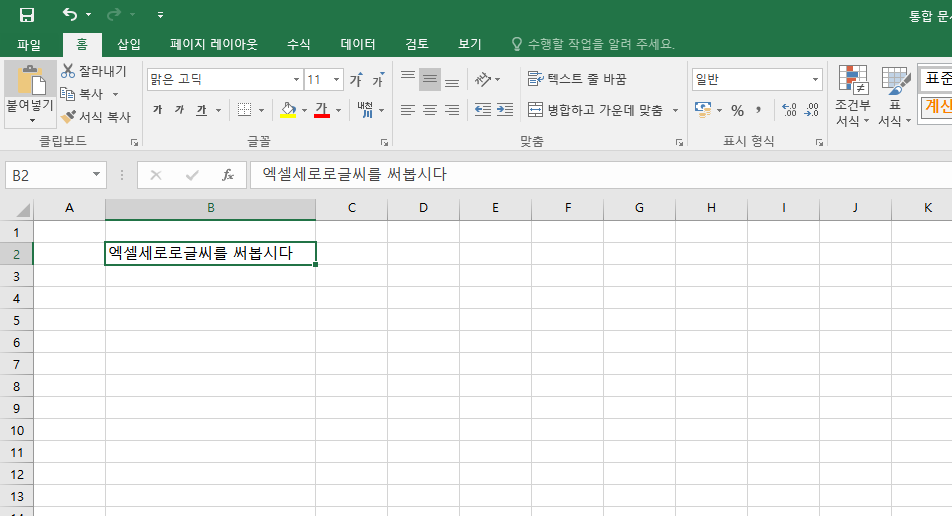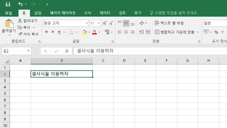 먼저 글씨를 입력해줍니다. 그리고는 단축키 Ctrl + 1 를 눌러줍니다.(또는, 셀을 선택하고 마우스 우클릭하셔서 셀서식을 선택하셔도 됩니다.)