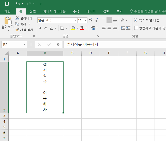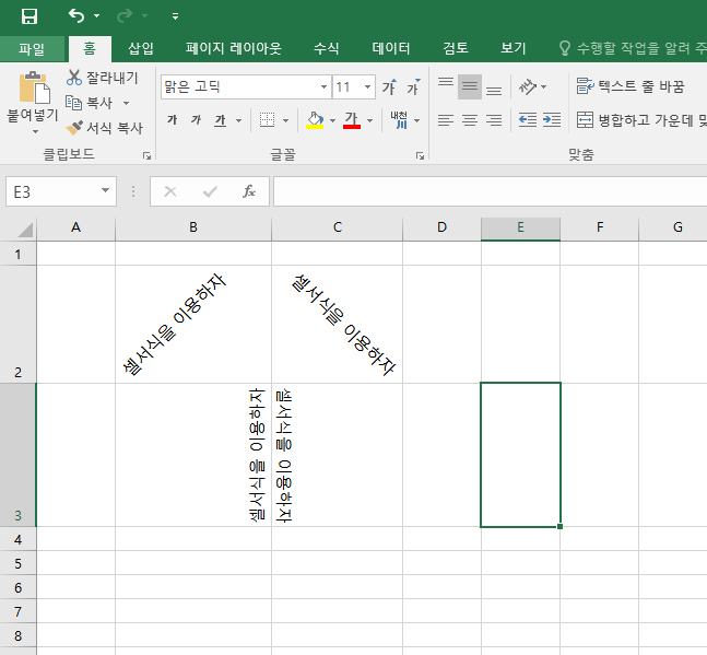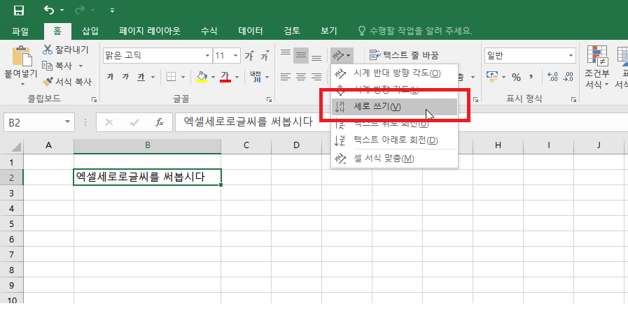 홈탭을 이용하지 않고, 셀서식을 통해 가로로쓰기가 가능합니다. 또한, 다양한 각도로 조정이 가능하니 미세한 조정을 원하신다면, 셀 서식을 이용하시면 좋을 것 같습니다.