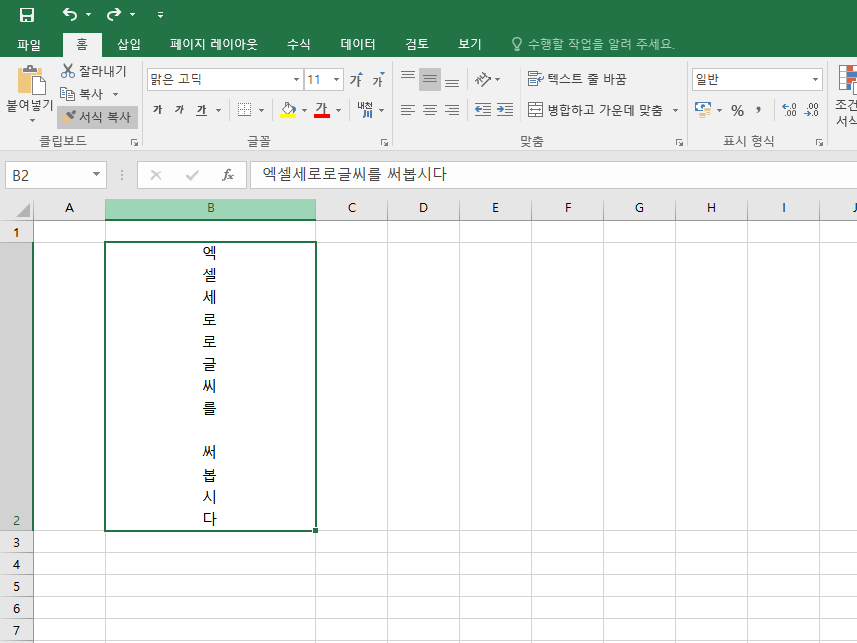 먼저 세로로 쓰기할 글씨를 셀에 입력합니다.