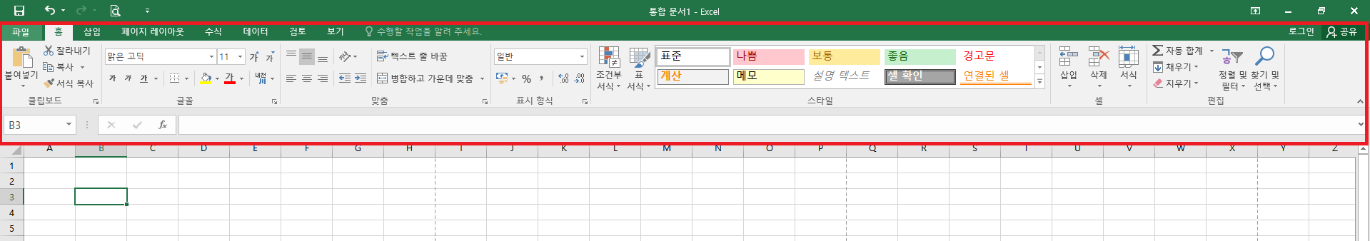 리본이란 엑셀에서 가장 자주 사용하는 명령어들을 그래픽 버튼으로 쉽게 클릭하여 사용할 수 있도록 만든 명령어를 집합입니다.