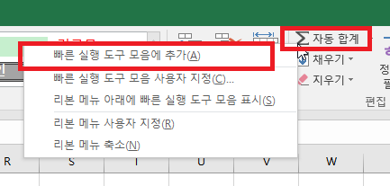 먼저 자동합계를 마우스 우클릭으로 선택하여줍니다. 그런 뒤 빠른 실행 도구 모음에 추가를 선택하여 줍니다.