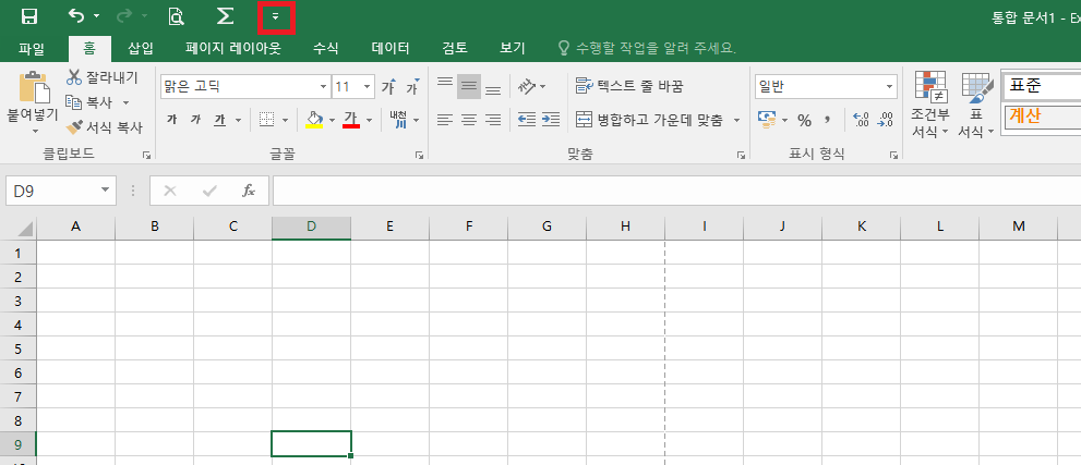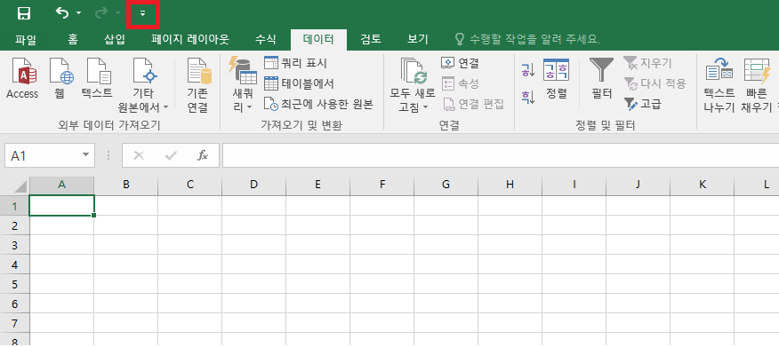 마지막으로 리본에 없거나 자주 사용하지 않는 기능이지만 필요한 기능을 도구 모음에 추가해보겠습니다. 먼저 빠른 실행 도구 모음에 있는 아래화살표를 선택하여 줍니다.