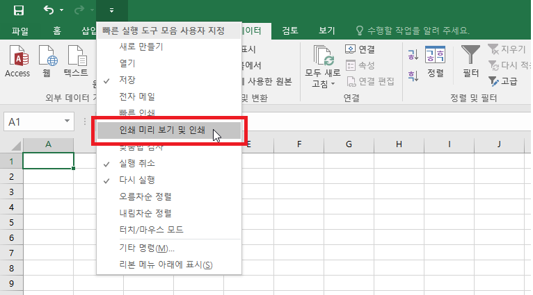 그러면 기본적으로 엑셀이 자주 사용한다고 생각하는 여러개의 항목에 대해서는 바로 추가가 가능합니다. 한번 인쇄 미리 보기 및 인쇄를 추가하여 보겠습니다.