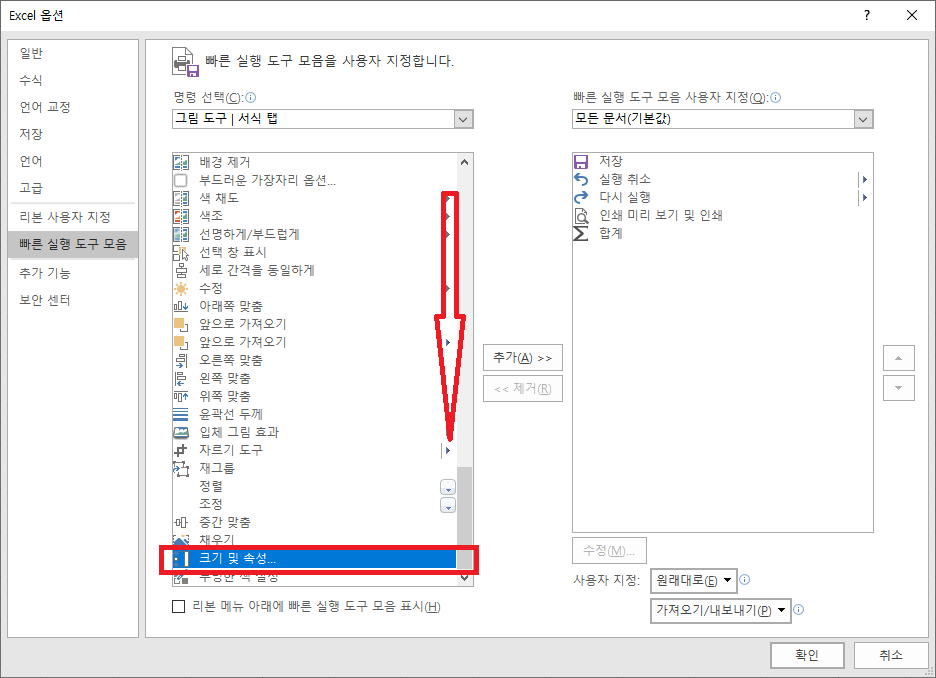 예제로 그림 도구 - 크기 및 속성을 추가해보도록 하겠습니다. 저는 보고서등을 사용할 때 이미지들을 많이 추가하는데 그 이미지들이 사이즈가 각각달라서 크기 및 속성을 이용하여 사이즈를 맞춰주는데 사용합니다. 그래서 자주 사용하다 보니 빠른 실행 도구에 추가해놓으니 훨씬 더 효율적인 업무가 가능했습니다. 그럼 추가해보시죠.