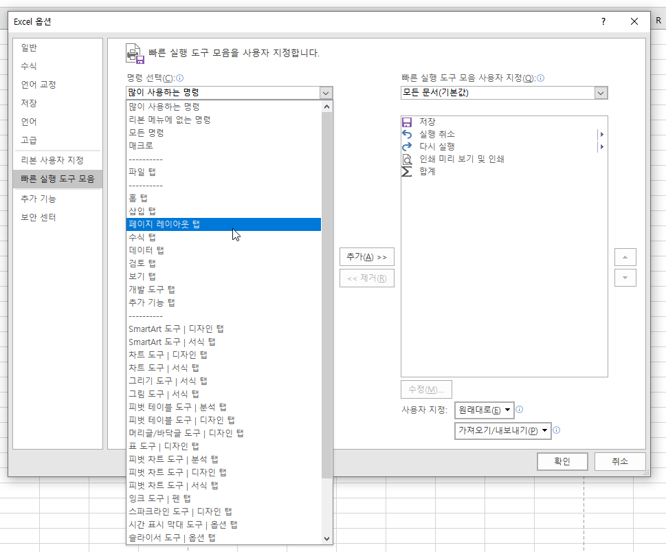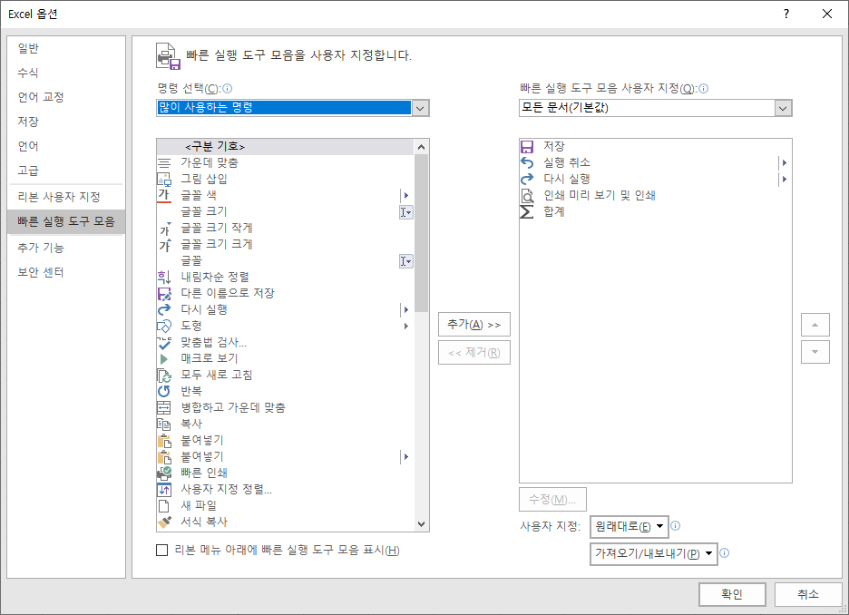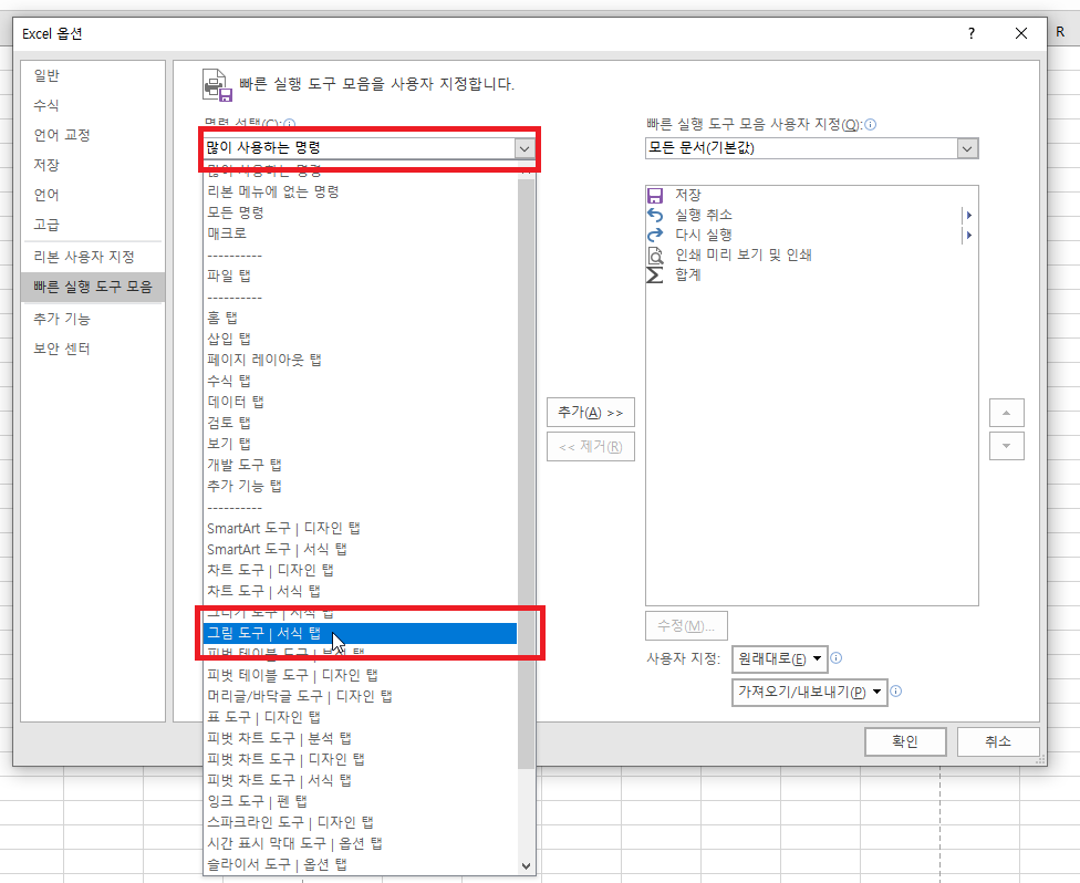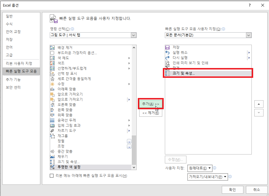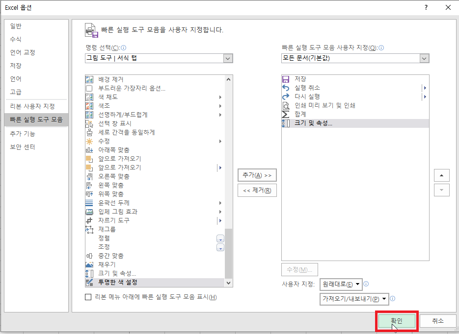 그러면 다음과 같은 창이 뜹니다. 여기서 필요한 내용을 선택하고 중간에 있는 추가 버튼을 눌러주면 빠른 실행 도구 모음에 추가가 됩니다. 마지막으로 확인 버튼만 눌러주면 됩니다.
