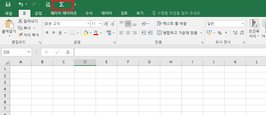 이 구간에 있는 것들이 리본이라고 생각하시면 됩니다. 항상 사용하시는거니까 어렵지 않으실꺼에요. 그중에 자주 사용하는 기능을 빠른 실행 도구 모음에 추가해보겠습니다. 저는 자동합계를 많이 사용하니 자동합계를 추가해보겠습니다.