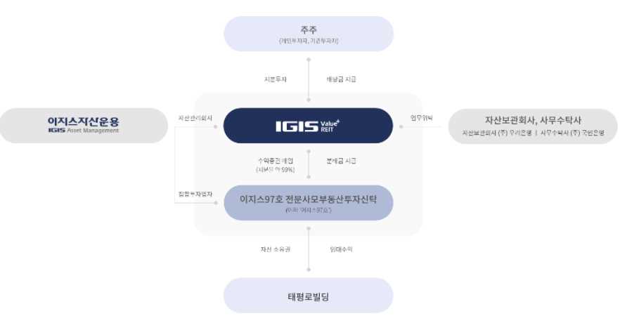 - 이지스밸류리츠는 '태평로빌딩'을 보유한 '이지스97호'의 수익증권 99.9%를 매입하여 실질적으로 태평로빌딩에 투자하고 있습니다.