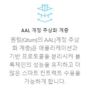 - 퀀텀의 주요 목표 중 하나인 최초로 지분증명의 UTXO에 기반한 스마트 계약 시스템을 구축하는 것이다. AAL은 이러한 시스템을 구축하는 핵심기술이며, 비트코인의 결제시스템인 UTXO와 이더리움 가상머신(EVM)을 결합하여 만들어졌다.