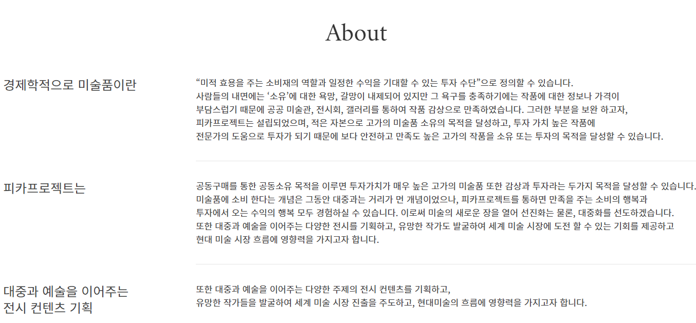 - 피카프로젝트는 공동구매를 통한 미술품의 공동소유와 투자가치가 매우 높은 미술품들에 대한 감상과 투자라는 목표를 가지고 있습니다.