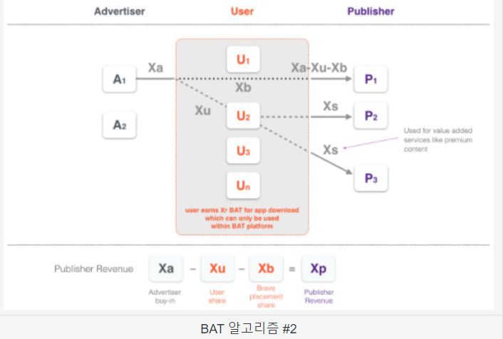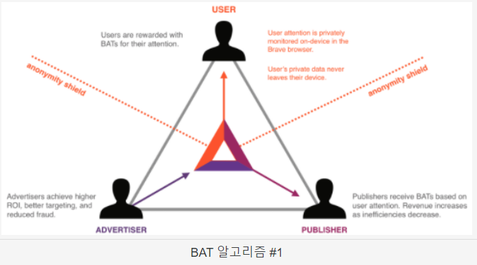 - 먼저, 광고주들이 BAT을 광고료로 준비한다. 그 다음, 컨텐츠 크리에이터(유튜버, 트위치 스트리머 등)와 퍼블리셔(인터넷 신문, 유튜브, 트위치 등)는 유저가 광고를 볼때마다 일정 BAT을 받는다. 또한 유저도 광고를 봐준 대가로 일정 BAT을 받는다. 이 때, 모든 광고 매칭이 머신 러닝 기반으로 자동화되어 있기 때문에, 중간 업체가 필요 없으므로, 유저, 퍼블리셔, 크리에이터 모두 돈을 더 받을 수 있게 된다.