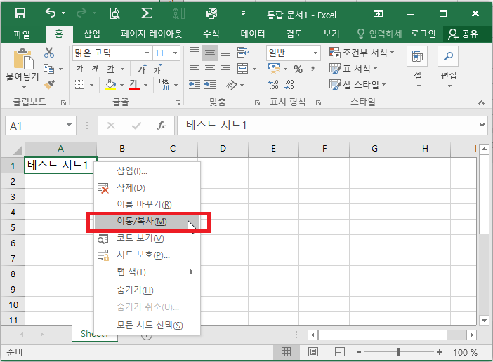 위에 빨간색박스에 있는 Sheet1 위에서 마우스 오른쪽 버튼을 눌러서 이동/복사(M)을 선택합니다.