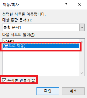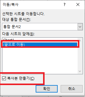 그러면 이동/복사 대화상자가 뜨는데 (끝으로 이동)을 선택하고, 하단에 복사본 만들기(C)를 체크 해준 뒤 확인을 눌러줍니다.